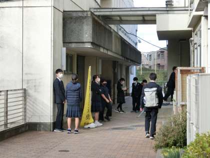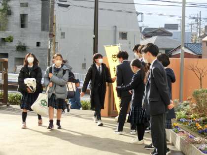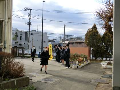 今朝は北風の冷たい中、生徒会役員と生活委員が、正門と1年昇降口で元気よく「おはようございます」と声をかけて、今日もスタートです。