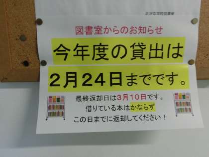 まだ、本を借りて返していない人は、早めに返却しましょう。特に3年生は3月で卒業ですので、必ず返却してください。