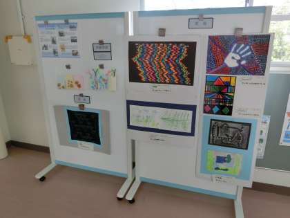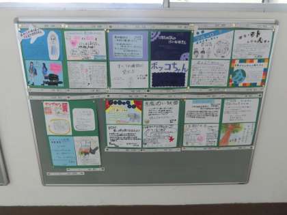 上から、1年生「本のPOP」・おおぐま「美術作品」・1年社会科「ヨーロッパの国調べ」