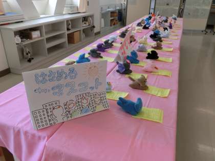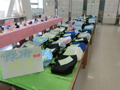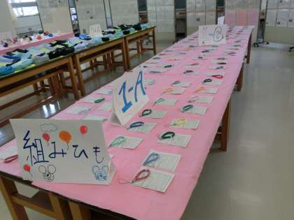 上から、1年家庭科「組みひも」・2年家庭科「保冷ランチバック」・3年家庭科「はさめるマスコット」
