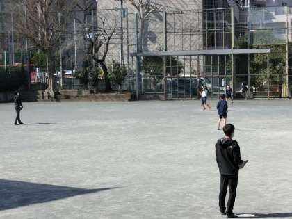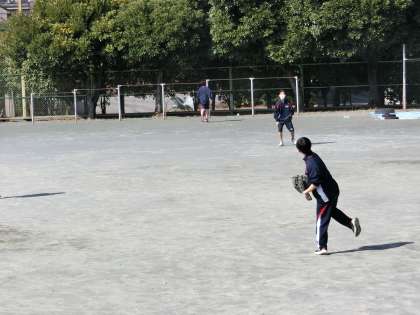 暖かい校庭で、ソフトボールのキャッチボールを二人一組で行っていました。