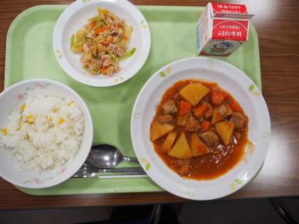本日の給食は、コーンライス、ポークシチュー、ツナサラダです。