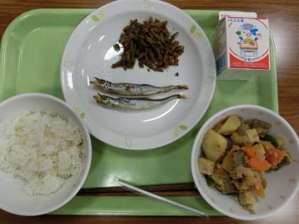 発芽玄米ごはん ・焼きししゃも ・じゃが芋うま煮 ・金平ごぼう ・牛乳 です。
