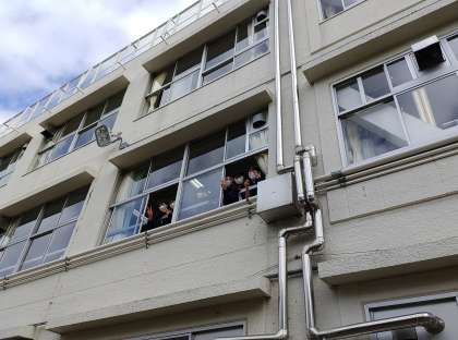 教室の窓から、副校長の姿を見つけてあいさつ 朝から元気いっぱい、こちらも元気になります。(副校長)