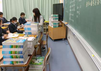 1年生は、教科書を配付しています。 乱丁落丁がないか確認して、名前を書いています。(副校長)