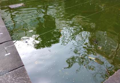 池のお魚さんの勢いに亀さんが押されています。亀さんがのんびりしていると、亀さんの餌も食べられてしまいます。小さな競争社会を見たような気がしました。