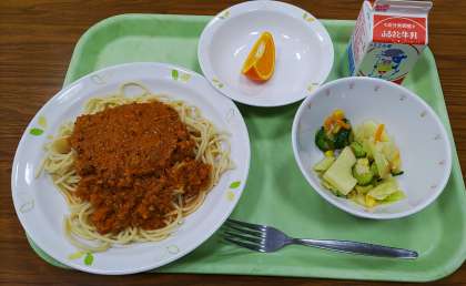 今日は生徒に人気のミートソーススパゲッティです。手作りならでは、ひき肉と野菜がたっぷりです。ジャガイモの入ったフレンチサラダの酸味がよいアクセントになっています。セミノールというのはオレンジの一種ですね。皮がむきやすく食べやすかったです。