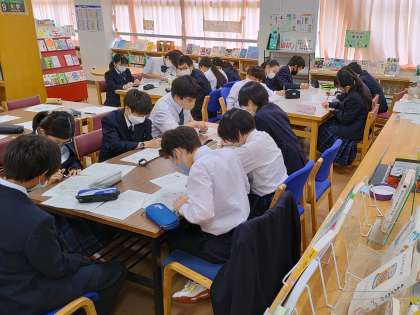1年生の話を聞く姿勢素晴らしいですね。待っている人も、分類マスターゲーム上級編に黙々と取り組んでいます。(副校長)