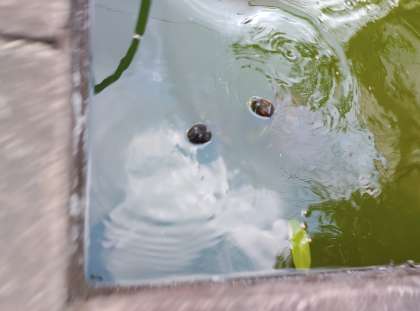 今朝は亀ちゃんものすごい勢いでこちらにやってきました!鯉さんの勢いに負けずしっかり餌を食べています。