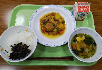 ふっくら炊き上がったご飯とひじきふりかけ、味噌汁もほっとする優しい味でした。厚揚げと小松菜の入ったお味噌汁も出汁が効いていて美味しかったのですが、ボリュームがあり、残食が多めでした。今日は気温が高くて温かいものが敬遠されたのかとか、そもそも量が多かったのかなどの原因を考えて対処して残食を減らしていけるよう栄養教諭と対策を考えてまいります。(副校長)