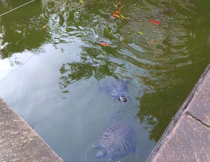 写真では、わかりにくいかもしれませんが、肉眼だと亀さんがゆったり近づいてくる様子がよくわかります。亀さんはのんびりしているのか、大きな鯉さんに餌を横取りされていますね。厳しい世界ですね。