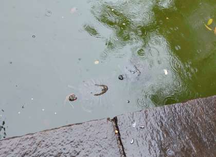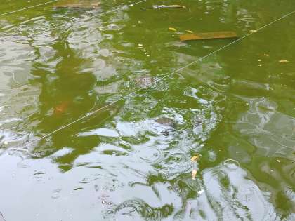 池の亀さんたち今日は声をかけると2匹ともこちらへやってきました。2匹仲良くお腹いっぱいになり満足げです。