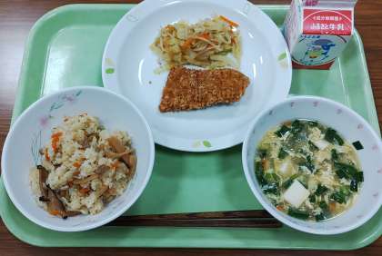 餅米の入った中華おこわのもちもち感、中華スープには、鶏肉も入って具たくさんのたまごスープが美味しかったです。中華サラダもごま油が効いた生徒の皆さんの好きな味付けでした。