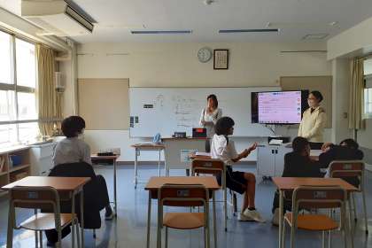 その間、先輩はALTと日本語混じりの英会話を楽しんでいます。(副校長)