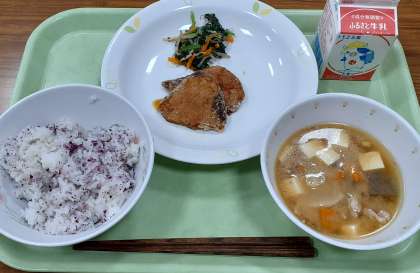 ご飯はゆかりご飯です。炊き立てのご飯にゆかりが混ぜ込んであり、酸味でさっぱりと食べられます。野菜の甘じょうゆ和え、豚汁も具だくさんです。いつも汁ものの残菜が多めなのですが今日はしっかり食べていました。美味しい和食でした。