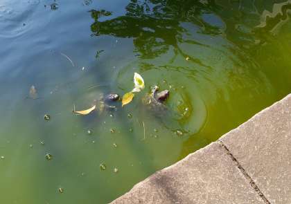 今朝は晴れて、池にも日差しが届いています。長雨で水位が上がっていますね。