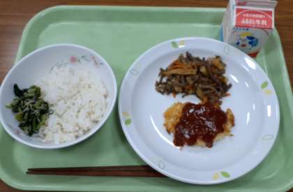 そして、芋きんぴらには根菜がたっぷり。じゃがいも、ごぼう、人参、こんにゃくと豚肉をごま油で炒めて甘辛く味付けしています。これもご飯に合いますね。みんなたくさん食べたかな?