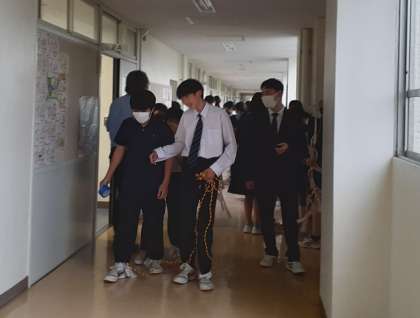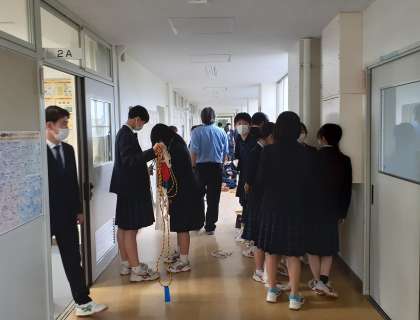 2年生は、雨天で校庭が使えないので学年種目の練習をしています。教育実習生も見ています。