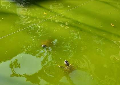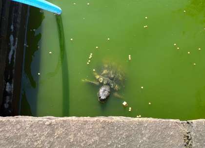最近亀男さんは近寄ってきません。今日もひとしきり食べ終えた亀子さんが亀男さんのところに行きました。副校長はこわくないよ。餌をくれるいい人だよ。と伝えていると良いのですが…