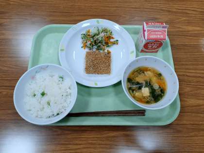 今朝、調理員さんは、山ほどのグリーンピースのさやむきをして、グリーンピースご飯をつくってくれました。ふっくらご飯に鮮やかな緑が映えます。