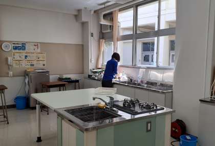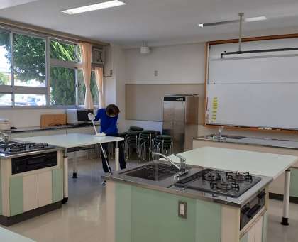 主事が3年間使ってなかった調理室の清掃を行っています。今年こそは家庭科の調理実習を行いたいと思います。(副校長)