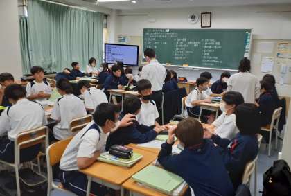 生徒の話し合いの場面では教育実習生も様子を見ています。(副校長)