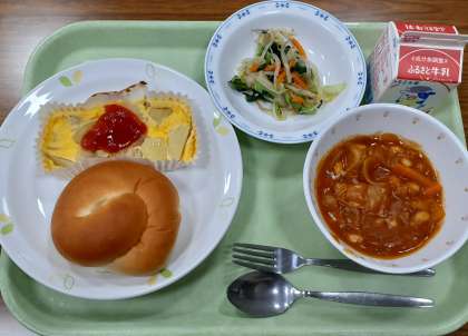 ハム、じゃがいも、玉ねぎ、ピーマンの具だくさんのスペイン風オムレツとポークビーンズ、野菜サラダ、ミルクパン、牛乳です。