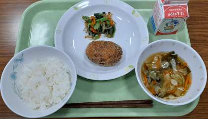味噌汁は、キャベツなどの野菜の甘味が出ていました。お浸しとふっくらご飯と牛乳で今日も美味しくいただきました。