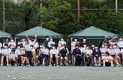 本日の予行練習でテントを立てた時は、生徒の皆さんもとても喜んでいました。しかし、1つのテントにクラス全員が入ると密集してかえって蒸し暑くなるから、間隔をあけて座りたい、テントは生徒席の後ろに設置してほしいというご意見が寄せられました。そこで、テントは生徒席の後ろに設置いたしました。生徒の皆さんはいつでもテントの中に移動してよいということを教職員で確認いたしましたので、天候や体調に合わせて適宜テントの中から見学し、応援してください。(副校長)