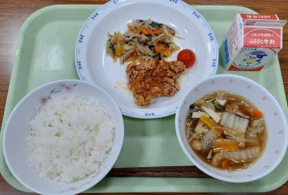 油淋鶏、炒合菜、中華スープ、プチトマト、ご飯、牛乳です。