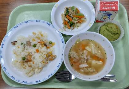 ピラフ、野菜サラダ、ポテトスープ、明日葉マフィン、牛乳です。