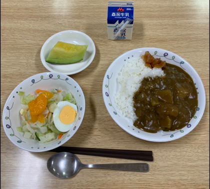 メニューは、カレーライス、サラダ、メロン、牛乳です。カレーライスはおかわりもできますよ。