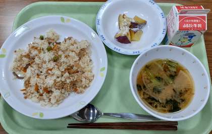 今日のメインは、こぎつねご飯です。砂糖、しょうゆでしっかり味付けした鶏肉、油揚げ、人参などをご飯に混ぜたものです。