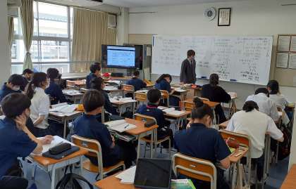 文章題を連立方程式を使って解いています。未知数をx.yとすると、文章そのものが方程式になります。その良さに気づいてほしいですね。(副校長)