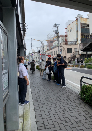 おおぐま学級 上級学校訪問 バスを待っている様子です。 公共のマナーも学びます。(おおぐま学級担任)