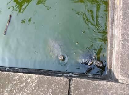 今朝の亀さんたち、2匹揃って元気です。鯉さんたちも元気です。(副校長)