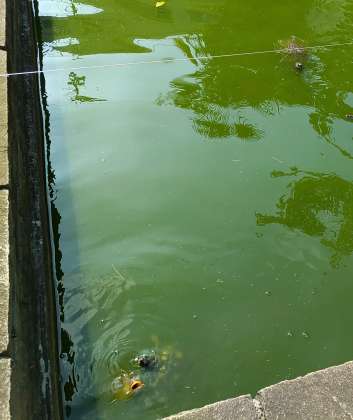 今朝は亀さんたち2匹とも上手に餌を食べています。写真に鯉さんの大きな口が写っていますね。いつもこうやって戦っているのです。
