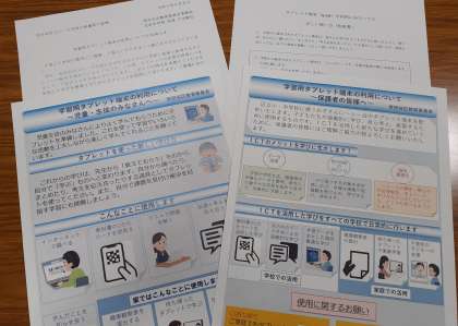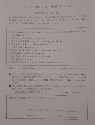 本日、1年生に4枚のプリントを配布し、事前指導を行いました。1年生のご家庭では、この週末にタブレットの使い方について話し合っていただき、タブレット端末の利用にあたっての正しい使い方「約束書」にサインをお願いいたします。この約束書をご提出いただいた方から、タブレットをお渡しします。