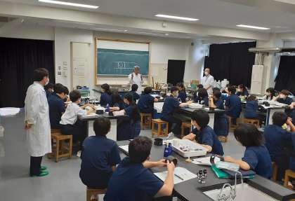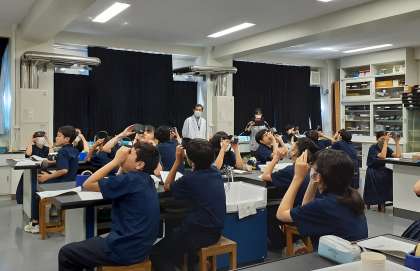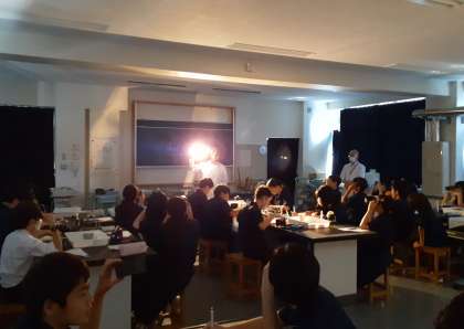 光の種類によって色の見えかたがどう違うのか観察しています。きれいですね。不思議ですね。(副校長)
