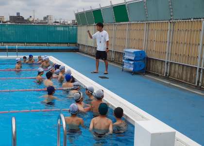 水泳授業は、安全に行うことが大切なので、しっかりと話を聞くことができるといいですね。(副校長)