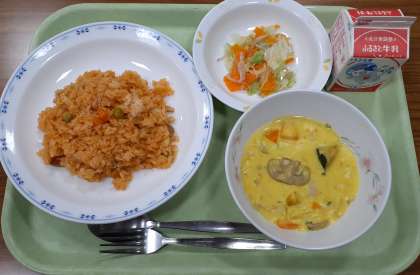 今日のチキンライスには、鶏肉、人参、マッシュルーム、玉ねぎ、グリンピースが入っています。ケチャップ味のご飯です。グリンピースを避けないでくださいね。