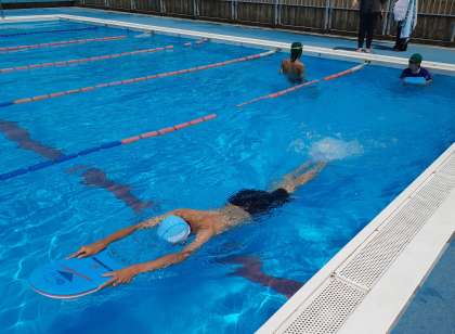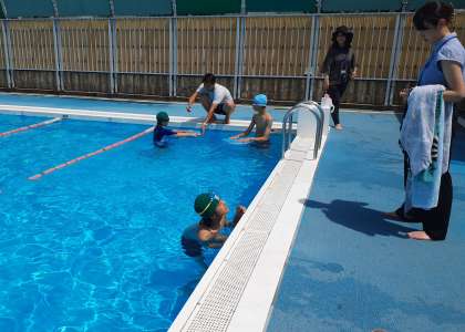 プール日和 公開日 2023/07/07 更新日 2023/07/07 できごと おおぐま学級 体育 水泳 水慣れのあとは、ビート板を使ってバタ足の確認をしています。膝を伸ばすといいよ。とアドバイスを受けています。(副校長)