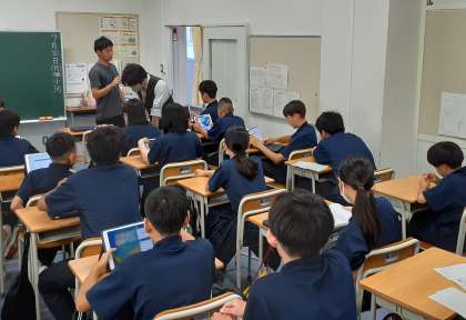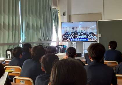 生徒会サミットのメンバーからの動画を視聴したあと一人一人が学校を良くするためのアンケートに答えています。