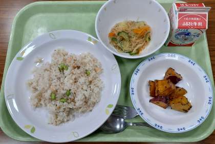 今日の鮭と枝豆の混ぜご飯はほぐした焼き鮭と塩ゆでした枝豆を麦入りご飯に混ぜています。暑い日には、塩味のご飯はすすみやすいですね。富士中の分と合わせて13キログラム以上の焼き鮭をほぐし、枝豆を鞘からはずす作業は本当に大変だったと思います。調理員さん、ありがとうございました!