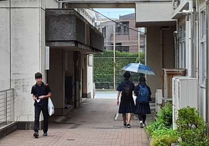 今朝は、小雨が降っていて、傘をさしている人もいればさしていない人もいますね。(副校長)