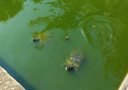 池の亀さんたち仲良く餌を食べています。鯉さんたちは今朝はおとなしいです。きっと週末に警備員さんからたくさん餌をもらったのでしょうね。(副校長)