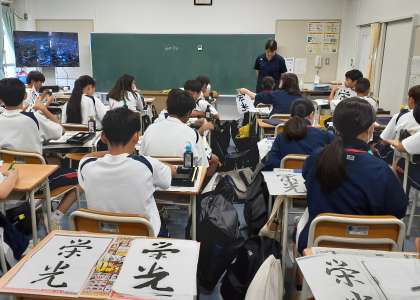 栄光 公開日 2023/07/19 更新日 2023/07/19 できごと 1年生 国語 書写 栄光という文字の行書に挑戦しています。勢いのある良い作品ですね。人によって線の太さ、文字の大きさが様々ですね。(副校長)