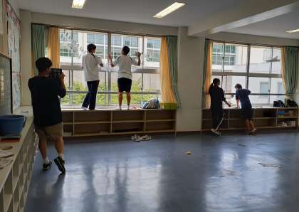 働く生徒の写真を撮る担任の姿がありますね。(副校長)