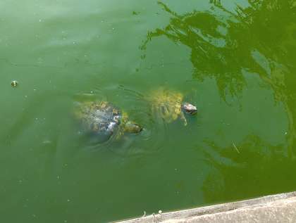 今朝の亀さんたち、2匹仲良く餌を食べています。2匹の争いにならないのは、餌の投げ方がうまくいっているからかな?(副校長)