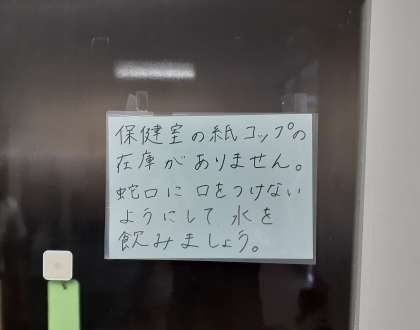 5月8日から、新型コロナウイルス感染症が5類に引き下げになったときに、校内で紙コップの配布については、在庫がなくなるまで継続することとしていましたが、1学期が終わりちょうど在庫がなくなりましたので、紙コップの配布を中止にいたします。